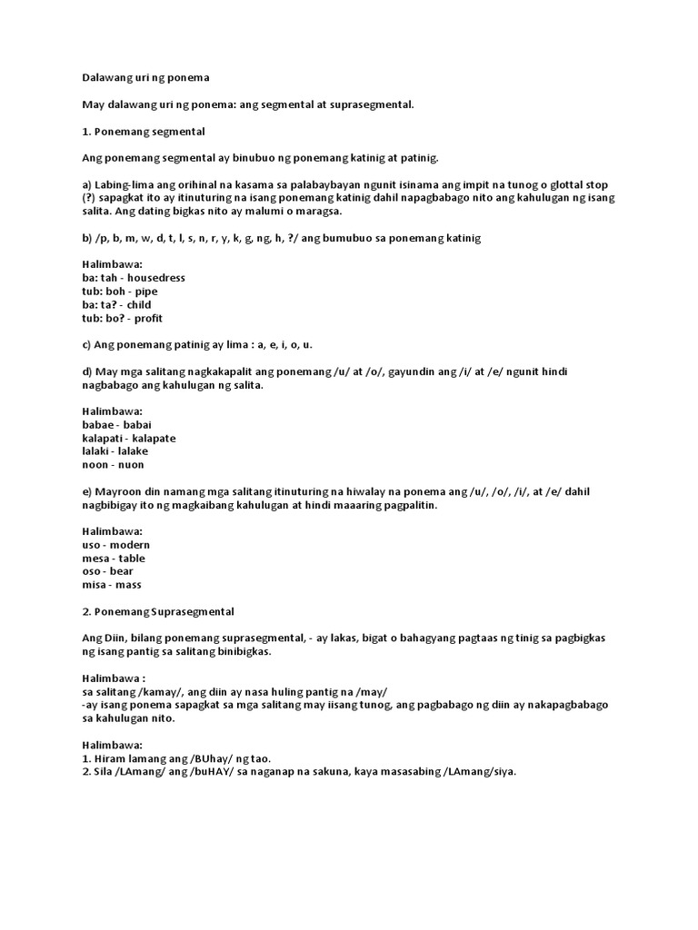 Una malaman ang bilang ng ponemang segmental mayroon ang wikang Taubuid ikalawa mailarawan ang deskripsyon ng bawat ponemang segmental nito. PONEMANG SUPRASEGMENTAL NG FILIPINO Kabilang sa ponemang suprasegmental ng wikang Filipino ang. Ang diin stress ay tumutukoy naman sa lakas ng bigkas ng pantig.