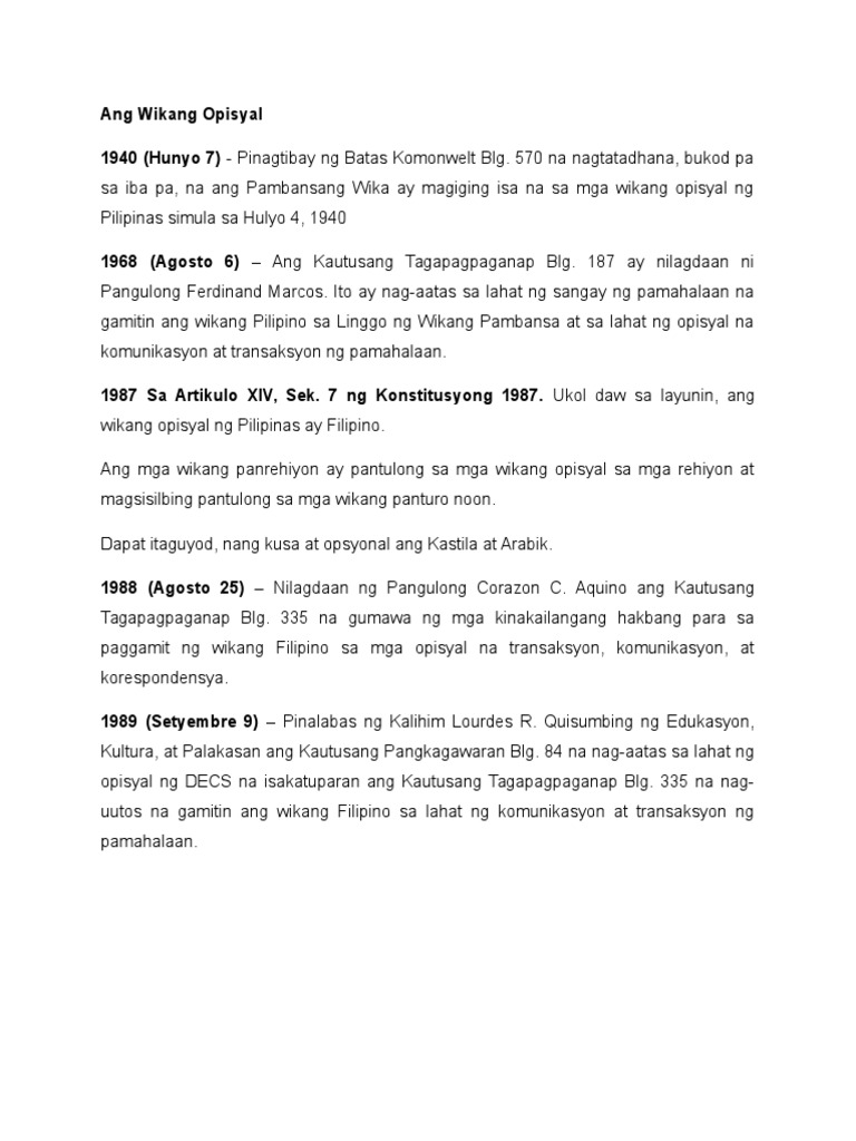 335 noong Agosto 25 1988na nag-uutos ng1. 7 1959 Dapat tawagin ang wikang pambansa na Pilipino na lang upang paikliin ang dati nitong katawagan. 81 1987 ang Alpabeto at Patnubay ng Wikang Filipino.