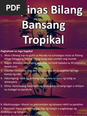 Kapag panahon ng Tag-init maraming turista ang dumarayo sa lugar na ito. Download as PPTX PDF TXT or read online from Scribd. Save Save AP- Aralin 4- Ang Pilipinas Ay Bansang Tropikal For Later.